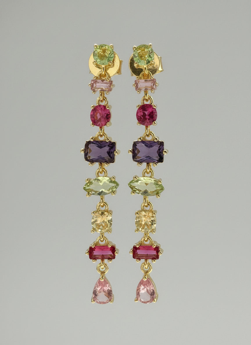 Our dainty multi stone drop earrings are really special because they exude femininity without being over the top. Built with an array of multi shapes, these are a playful alternative for your ear stack.